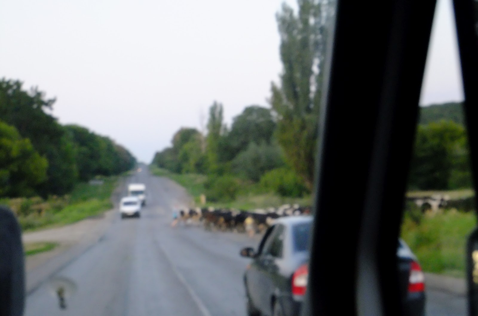 Yeah, we are taking over, the cars from the opposite direction are taking over, there are cows crossing (in assistance of a babushka) the street. What you do not see are the two village boys sitting on a small motorcycle on the right edge of the road driving in the wrong direction.